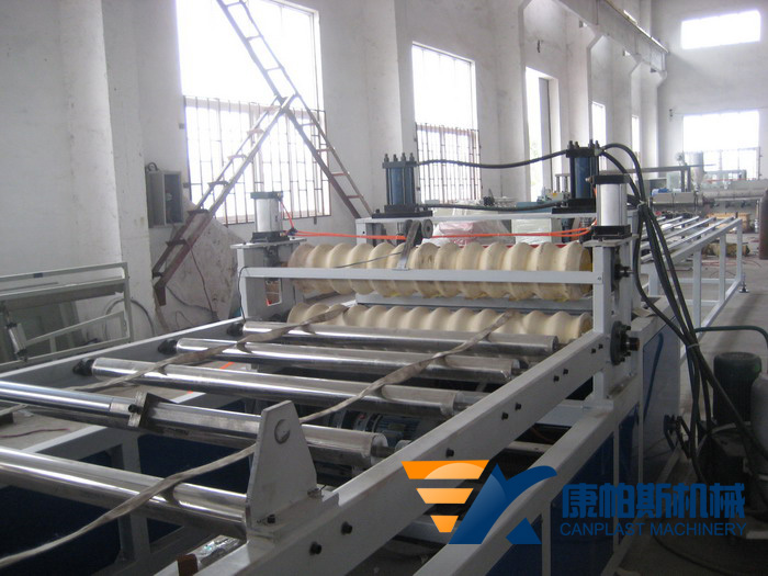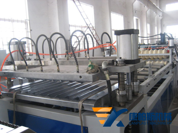 壓輥成形方式為,三輥冷卻片材利用上下壓輥壓出所要求的波浪板,優(yōu)點(diǎn)為生產(chǎn)速度高,方便調(diào)節(jié)、可隨時(shí)調(diào)節(jié)形狀及波浪高度,只需要換不同的壓輥就可加工不同的形狀波浪板、如梯形、圓弧形等。螺桿采用特殊混料功能及高塑化能力設(shè)計(jì),確保物料穩(wěn)定的高速押出。超靜的多翼式散熱風(fēng)機(jī),配合全不銹鋼獨(dú)、立封閉式機(jī)筒外罩,具備優(yōu)良的通風(fēng)散熱性能。擠出模具采用特殊的雙節(jié)流設(shè)計(jì),寬度厚薄調(diào)整更為精準(zhǔn)。減速箱:采用防噪聲箱體設(shè)計(jì),齒輪均經(jīng)高硬度特殊處理,配合強(qiáng)制式的潤(rùn)滑系統(tǒng),保證了減速機(jī)的超靜運(yùn)轉(zhuǎn)。配置雙流道液壓快換確保換網(wǎng)快捷,保持生產(chǎn)連續(xù)性。高精度三輥壓光機(jī)確保制品平整光滑。開合式紅外線導(dǎo)熱預(yù)處理機(jī),確保成型前整體受熱工藝要求及快速操作性。同步組合式成型裝置,確保快速成型、準(zhǔn)確。牽引裝置:精簡(jiǎn)的二輥式牽引結(jié)構(gòu),輥距自由調(diào)節(jié),變頻無(wú)級(jí)調(diào)速,適應(yīng)多種擠出速度的需求,亦為穩(wěn)定生產(chǎn)提供有力的保障。雙輥式牽引機(jī)配合精密邊料分切及邊料收卷裝置,確保運(yùn)行穩(wěn)定。特殊設(shè)計(jì)的雙邊式采用進(jìn)口優(yōu)質(zhì)鋼材合金刀片式切割裝置,切斷快速平整。切割裝置:合理的切割方式,、確保切割快速穩(wěn)定平整。控制系統(tǒng):多種控制系統(tǒng)選擇(如:PLC自動(dòng)化控制系統(tǒng)),滿足不同客戶的需求。