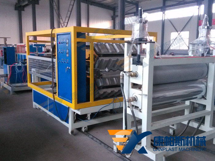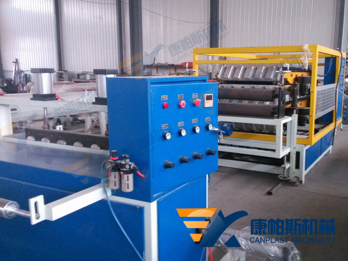 PVC仿琉璃瓦生產(chǎn)線,由二臺錐形雙螺桿擠出機,一臺單螺桿擠出機,共擠分配器,擠出模具及成型輔機組組成, 琉璃瓦生產(chǎn)線采用塑料機械行業(yè)首創(chuàng)的三層共濟技術(shù),琉璃瓦產(chǎn)品采用兩層共擠技術(shù)一次加工完成,每層材料各有功能表面材料:為超耐候樹脂,確保產(chǎn)品的耐久性和耐化學(xué)腐蝕性能;底層材料:為白色韌性材料,以增大廠房的空間感和光亮度。兩種不同材質(zhì)賦予了產(chǎn)品各自的功能特點,表面光滑并且有機結(jié)合在一起,PVC琉璃瓦生產(chǎn)線可連續(xù)生產(chǎn)PVC單層或PVC/PMMA及PVC/ASA共擠琉璃瓦. PVC琉璃瓦生產(chǎn)線具有生產(chǎn)效率高,操作簡便,結(jié)構(gòu)合理,維護方便,壽命長的特點。